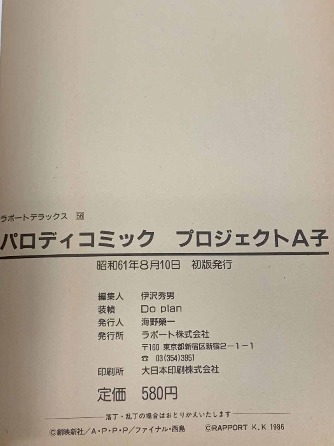 パロディコミック プロジェクトA子 昭和61年8月10日 ラポート(株) 真鍋譲治 矢野健太郎 影次ケイ