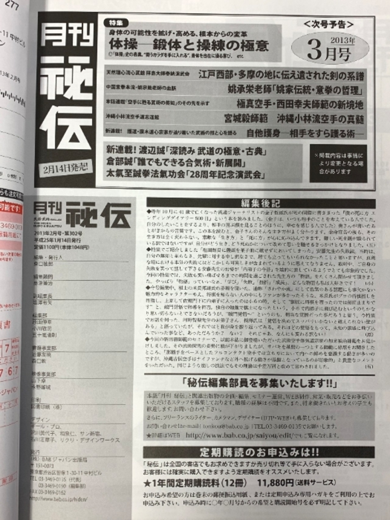 (7) 月刊 秘伝 武道・武術の秘伝に迫る 2013年2月号 “内弟子”その教伝システムが秘める学びの四訣 BABジャパン