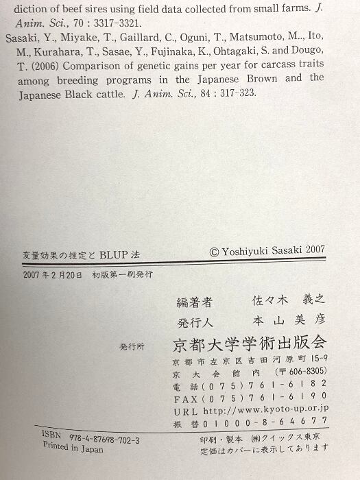 タイトル:変量効果の推定とBLUP法 京都大学学術出版会 佐々木 義之