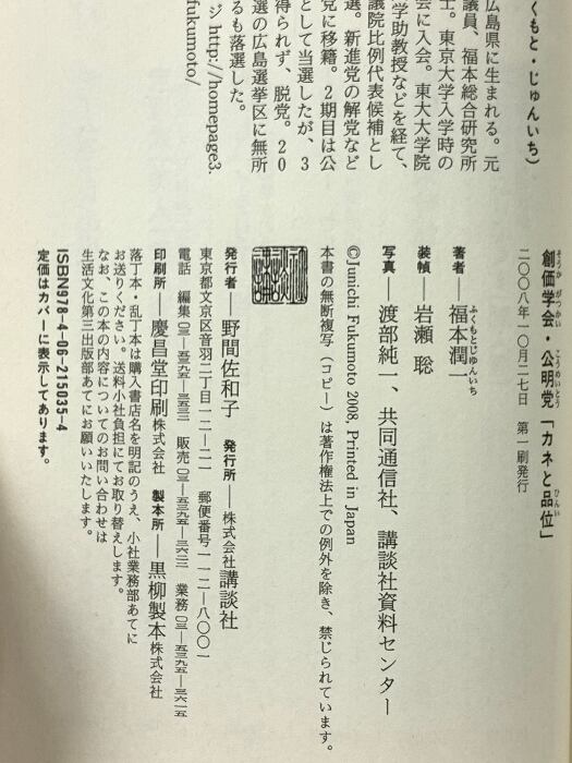 タイトル:創価学会・公明党「カネと品位」 講談社 福本 潤一