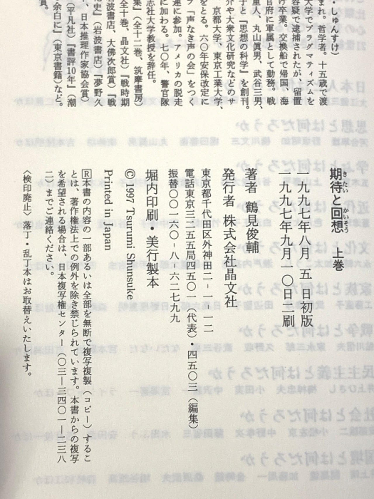 タイトル:期待と回想 上巻 晶文社 鶴見 俊輔