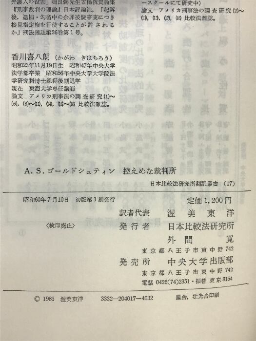タイトル:控えめな裁判所 (日本比較法研究所翻訳叢書 17) 中央大学出版部 A.S.ゴールドシュティン 監修:渥美東洋 訳:椎橋隆幸 他