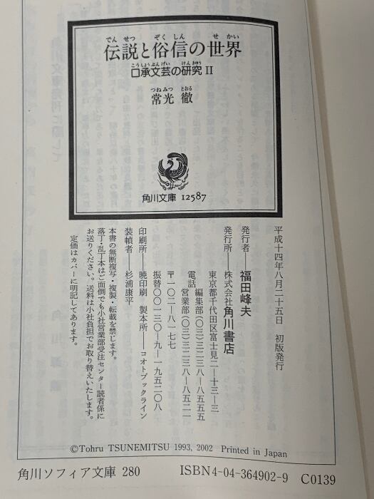 タイトル:伝説と俗信の世界 口承文芸の研究II (角川ソフィア文庫 280 怪BOOKS) KADOKAWA 常光 徹