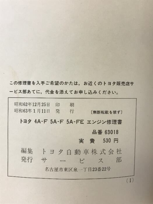 タイトル:TOYOTA エンジン修理書「63018」4A-F 5A-F 5A-FE 昭和63年 1988-1 トヨタ自動車