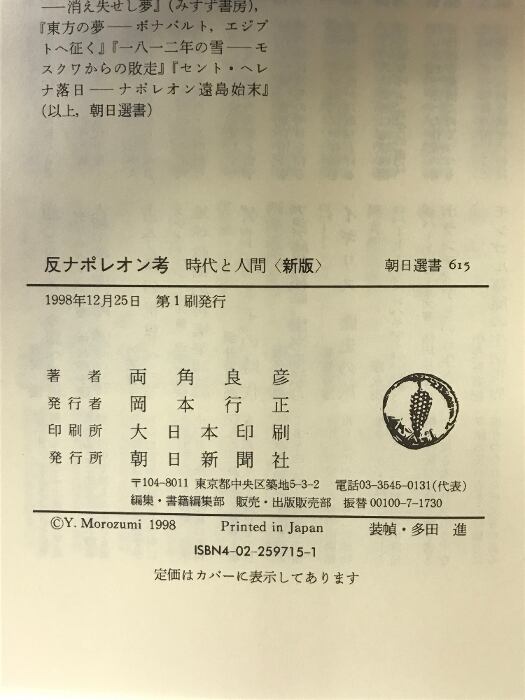 反ナポレオン考 新版: 時代と人間 (朝日選書 615) 朝日新聞出版 両角 良彦
