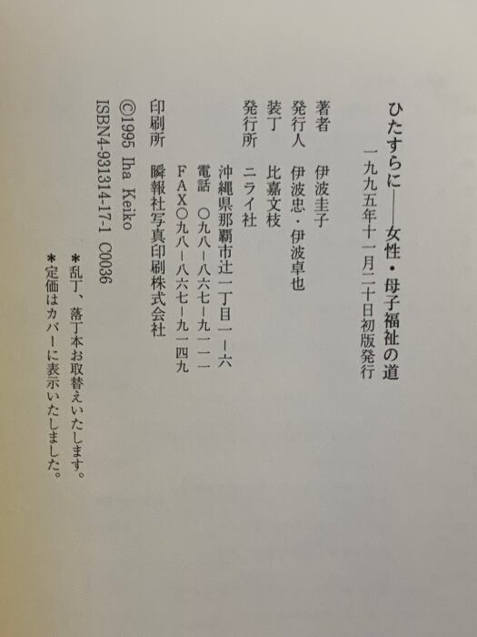 タイトル:ひたすらに: 女性・母子福祉の道 ニライ社 伊波圭子