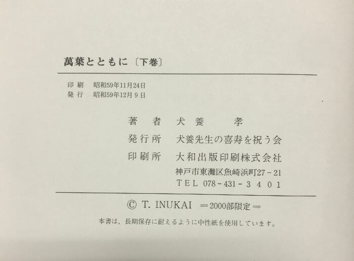 タイトル:萬葉とともに(上・下巻/全2冊セット)発行:犬養先生の喜寿を祝う会 著:犬養孝 昭和59年