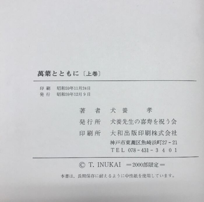 萬葉とともに(上・下巻/全2冊セット)発行:犬養先生の喜寿を祝う会 著:犬養孝 昭和59年