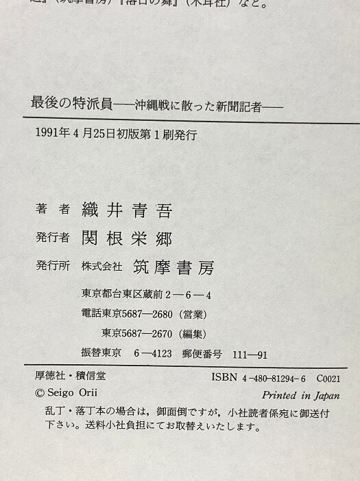 タイトル:最後の特派員 沖縄に散った新聞記者 筑摩書房 織井 青吾