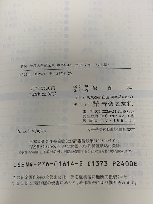 タイトル:世界大音楽全集 声楽編14 ポピュラー歌曲集2 音楽之友社