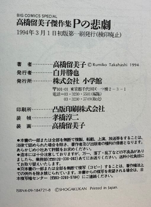 タイトル:高橋留美子まとめ(全3冊セット)Pの悲劇 赤い花束 Oの悲劇Oの喜劇 小学館 1994-2005年