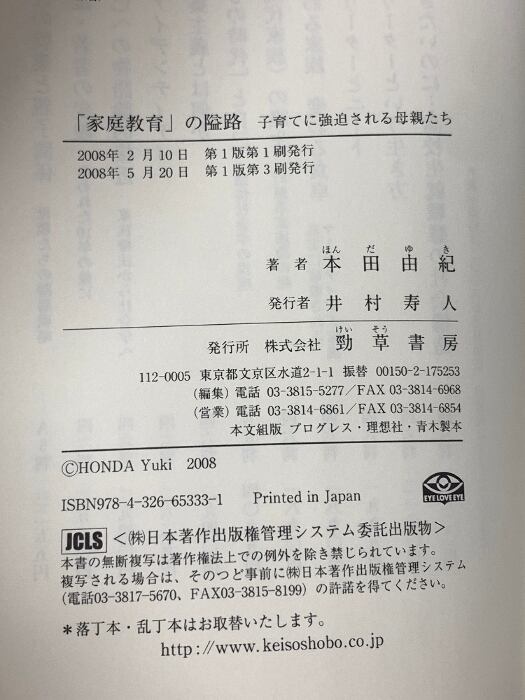 タイトル:「家庭教育」の隘路―子育てに強迫される母親たち 勁草書房 本田 由紀