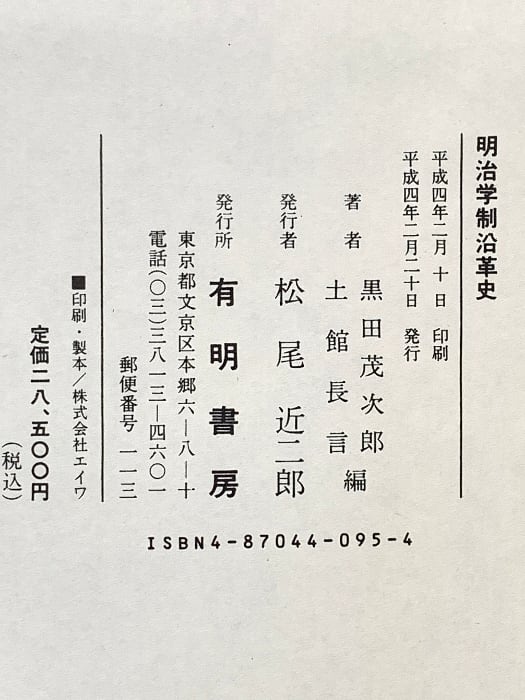 タイトル:明治学制沿革史 有明書房 黒田茂次郎