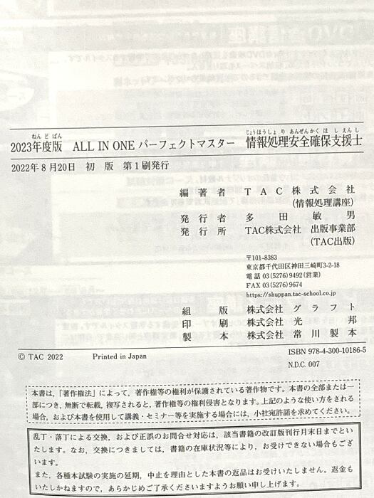 タイトル:ALL IN ONE オールインワン パーフェクトマスター 情報処理安全確保支援士 2023年度版 [すべてをこの一冊で! ](TAC出版) (情報処理技術者試験) TAC出版 TAC情報処理講座