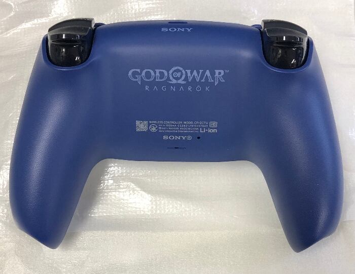 『ゴッド・オブ・ウォー ラグナロク』限定エディションのDualSense ワイヤレスコントローラーです。 北欧神話のミズガルズをモチーフにしたブルーとアイスホワイトのツートンカラーで、クレイトスとアトレウスを象徴する熊と狼のシンボルがあしらわれています。