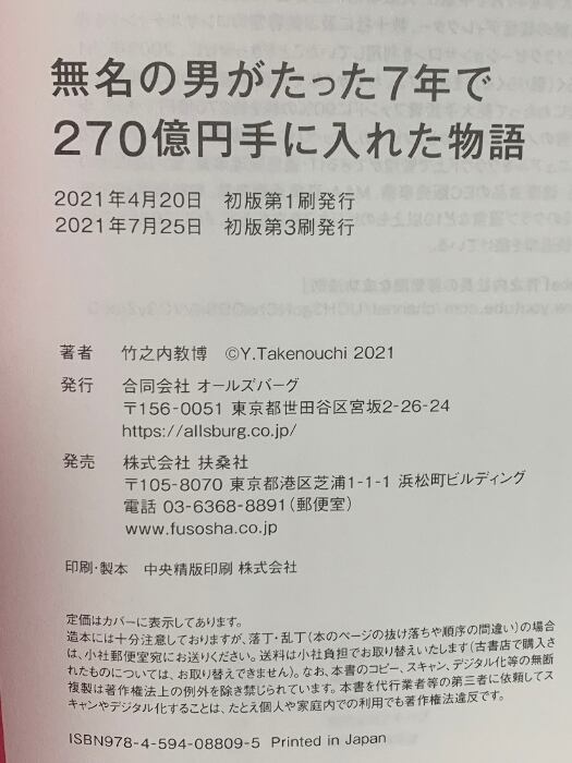 タイトル:無名の男がたった7年で 270億円手に入れた物語 扶桑社 竹之内 教博