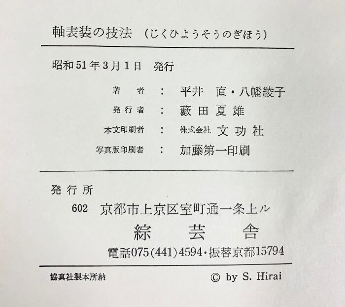 タイトル:軸表装の技法 綜芸舎 著:平井直・八幡綾子 昭和51年