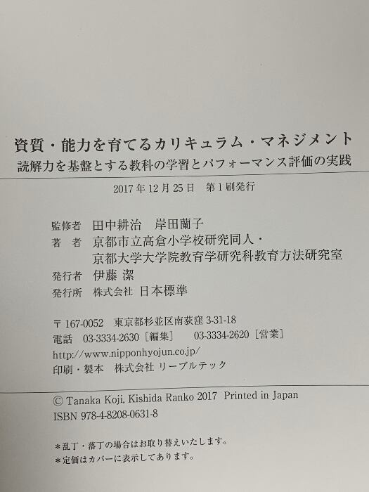 タイトル:資質・能力を育てる カリキュラム・マネジメント: 読解力を基盤とする教科の学習とパフォーマンス評価の実践 日本標準 京都市立高倉小学校研究同人・京都大学大学院教育学研究科教育方法研究室