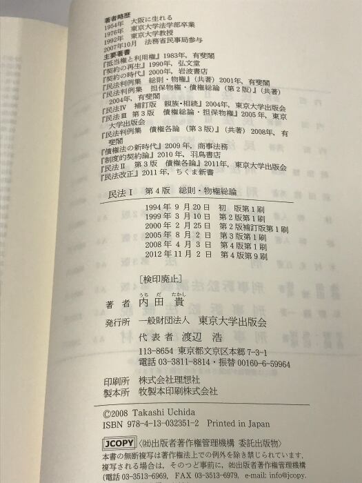 タイトル:民法I 第4版: 総則・物権総論 東京大学出版会 内田 貴