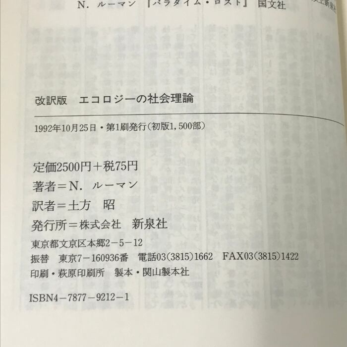 タイトル:エコロジーの社会理論 改訳版 現代社会はエコロジーの危機に対応できるか 新泉社 N. ルーマン