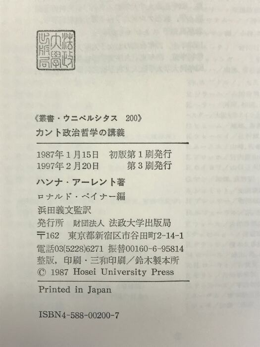 タイトル:カント政治哲学の講義 (叢書・ウニベルシタス) 法政大学出版局 ハンナ アーレント