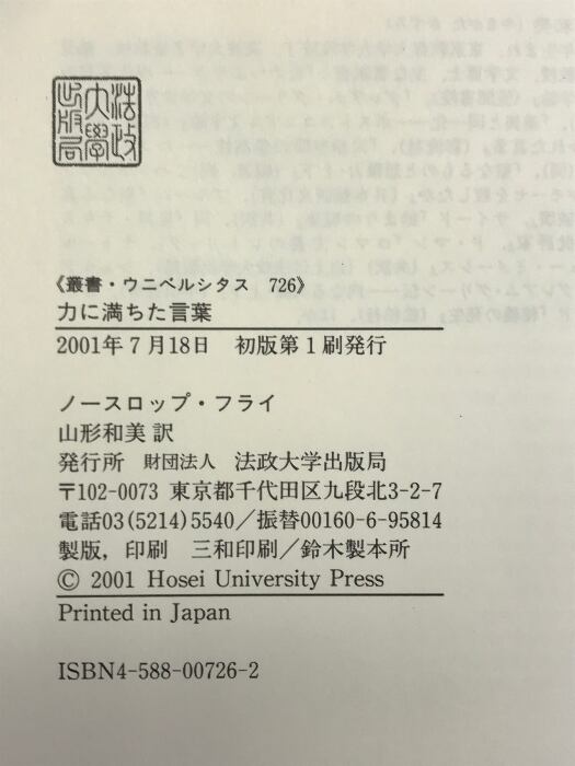 タイトル:力に満ちた言葉―隠喩としての文学と聖書 (叢書・ウニベルシタス 726) 法政大学出版局 ノースロップ フライ