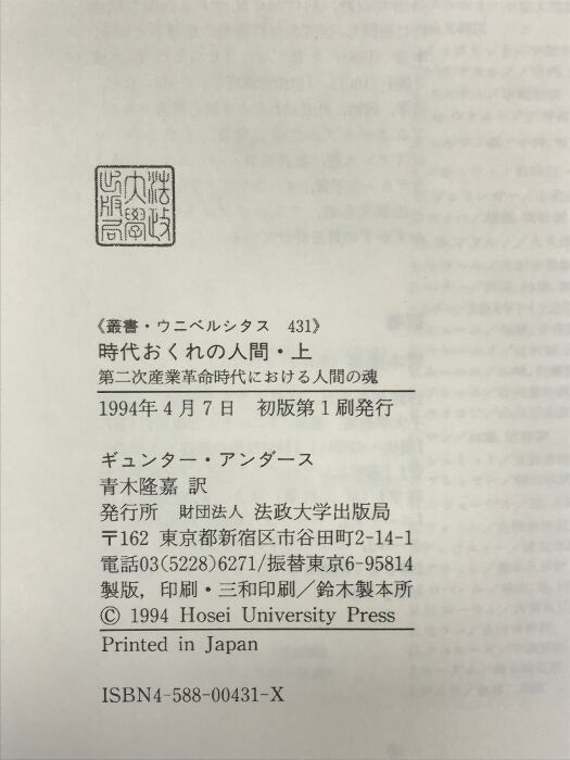 タイトル:時代おくれの人間 上 (叢書・ウニベルシタス 431) 法政大学出版局 ギュンター アンダース