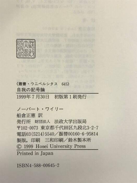 タイトル:自我の記号論 (叢書・ウニベルシタス 645) 法政大学出版局 ノーバート ワイリー