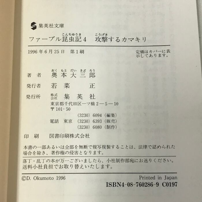 ファーブル昆虫記 4 攻撃するカマキリ (集英社文庫) 集英社 奥本 大三郎