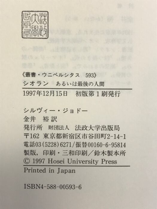 タイトル:シオラン: あるいは最後の人間 (叢書・ウニベルシタス 593) 法政大学出版局 シルヴィー ジョドー
