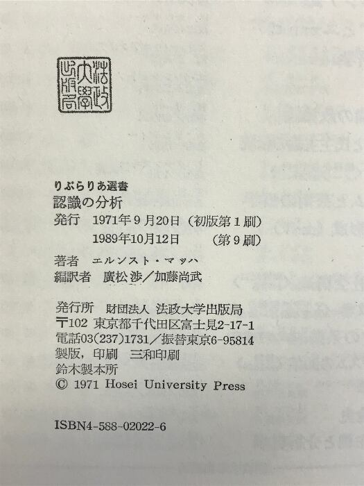 認識の分析 (りぶらりあ選書) 法政大学出版局 エルンスト マッハ