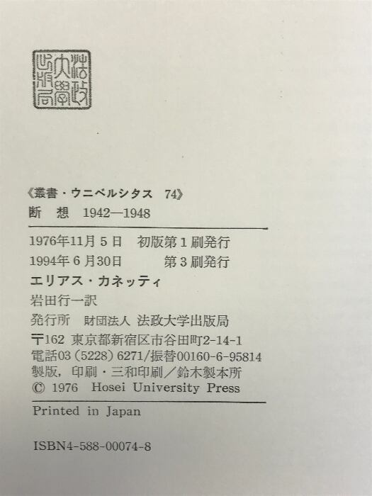 タイトル:断想: 1942-1948 (叢書・ウニベルシタス) 法政大学出版局 エリアス・カネッティ
