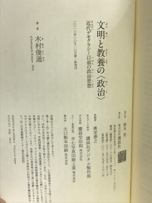 文明と教養の〈政治〉 近代デモクラシー以前の政治思想 (講談社選書メチエ) 講談社 木村 俊道