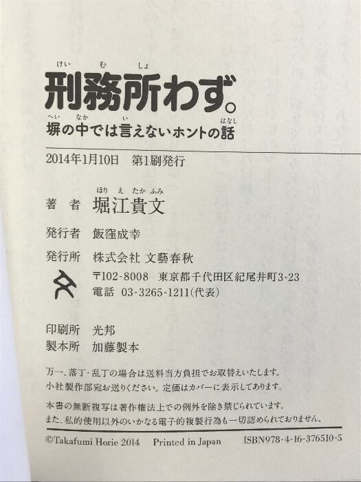 タイトル:刑務所わず。 塀の中では言えないホントの話 文藝春秋 堀江 貴文