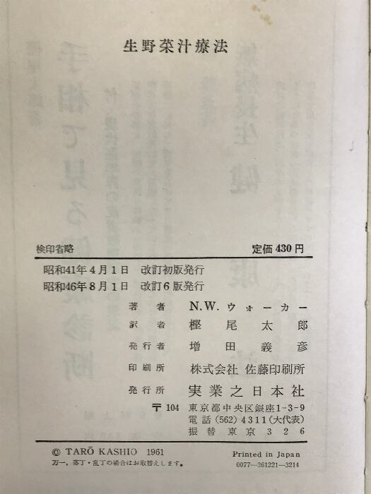 タイトル:生野菜汁療法 実業之日本社 N・Wウォーカー 樫尾太郎:訳