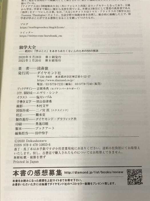 タイトル:独学大全 絶対に「学ぶこと」をあきらめたくない人のための55の技法 ダイヤモンド社 読書猿