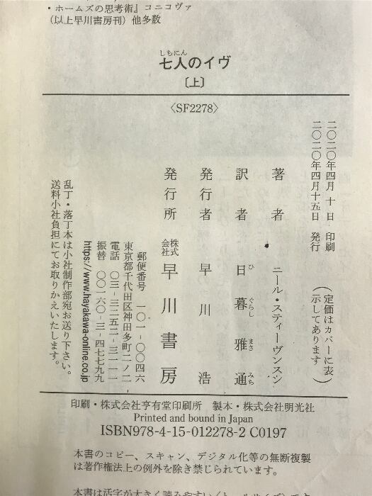 タイトル:七人のイヴ 上 (ハヤカワ文庫 SF ス 12-9) 早川書房 ニール・スティーヴンスン