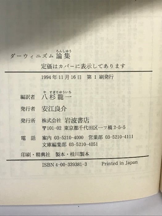 ダーウィニズム論集 (岩波文庫 青 938-1) 岩波書店 八杉 龍一