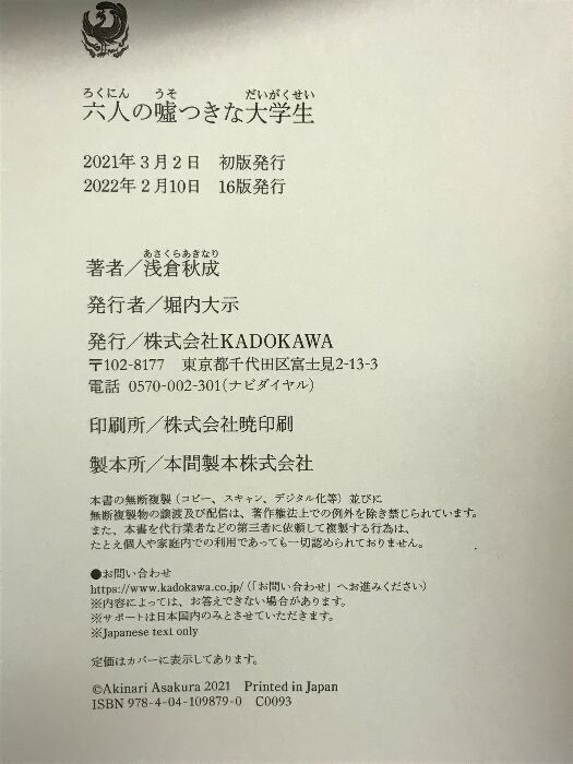 タイトル:六人の嘘つきな大学生 KADOKAWA 浅倉 秋成