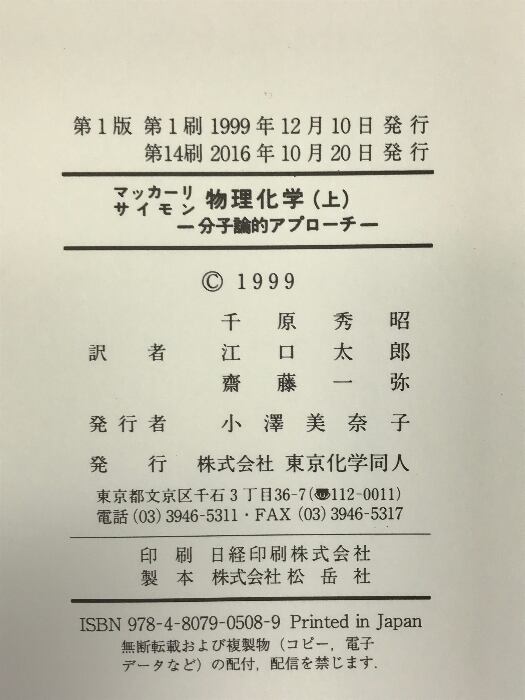 マッカーリ・サイモン物理化学: 分子論的アプロ-チ (上) 東京化学同人 ドナルド・A.マックォ-リ