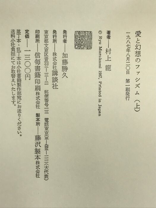 タイトル:愛と幻想のファシズム(上) 講談社 村上 龍