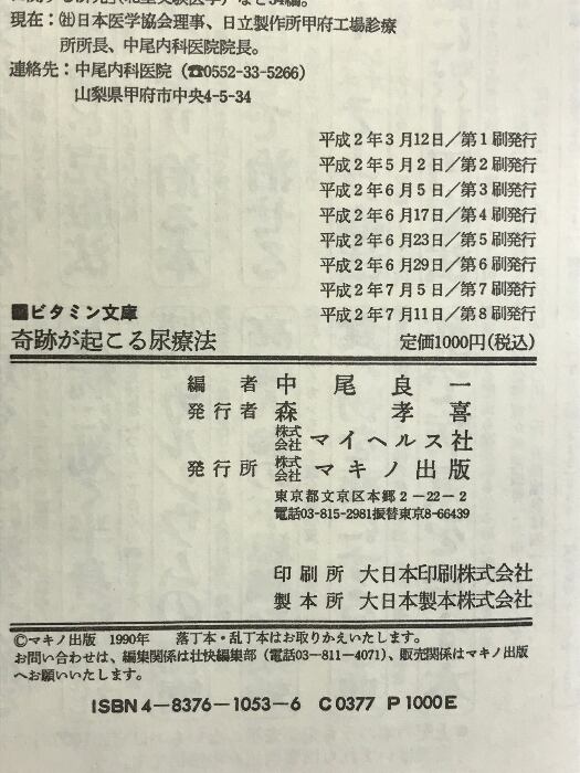 タイトル:奇跡が起こる尿療法: 勇気さえあれば、治らなかった病気が治る (ビタミン文庫) マキノ出版 中尾 良一