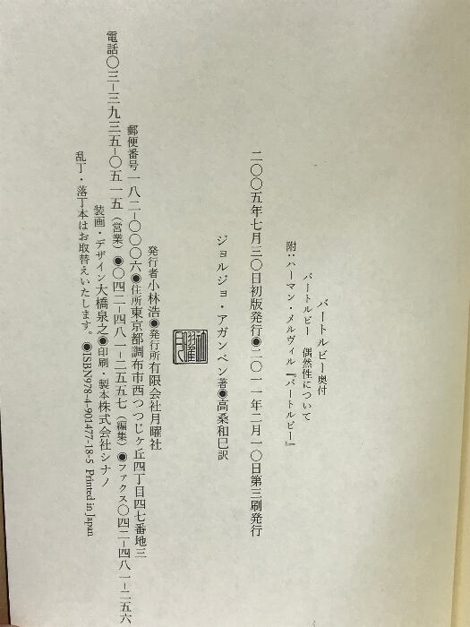 タイトル:バートルビー―偶然性について [附]ハーマン・メルヴィル『バートルビー』 月曜社 ジョルジョ アガンベン