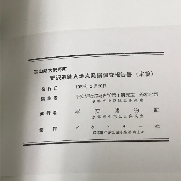 タイトル:野沢遺跡 富山県大沢野町 野沢遺跡発掘調査報告書 A地点 平安博物館 1982 遺物一覧表・別添図付き