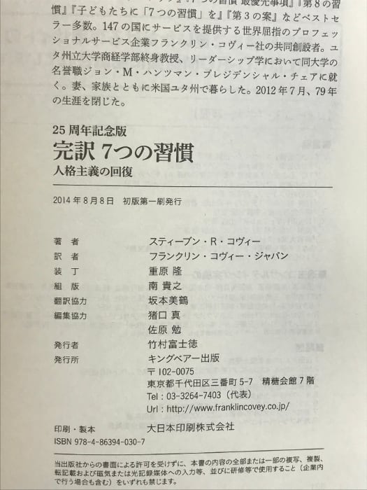 タイトル:完訳7つの習慣 25周年記念版 キングベアー出版 スティーブン・R・コヴィー