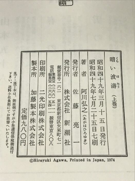 タイトル:暗い波濤 上下巻 2冊 セット 新潮社 阿川弘之