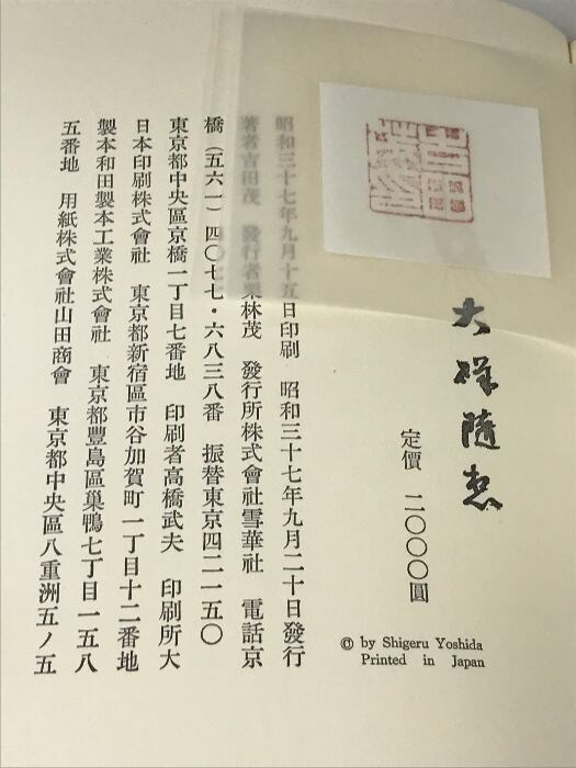 大磯随想 雪華社 吉田茂 講話条約発効十周年記念出版