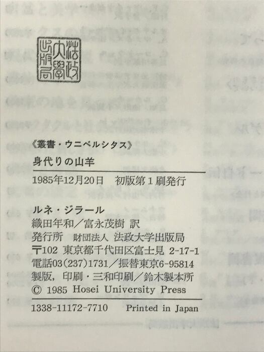 タイトル:身代りの山羊 (叢書・ウニベルシタス) 法政大学出版局 ルネ ジラール