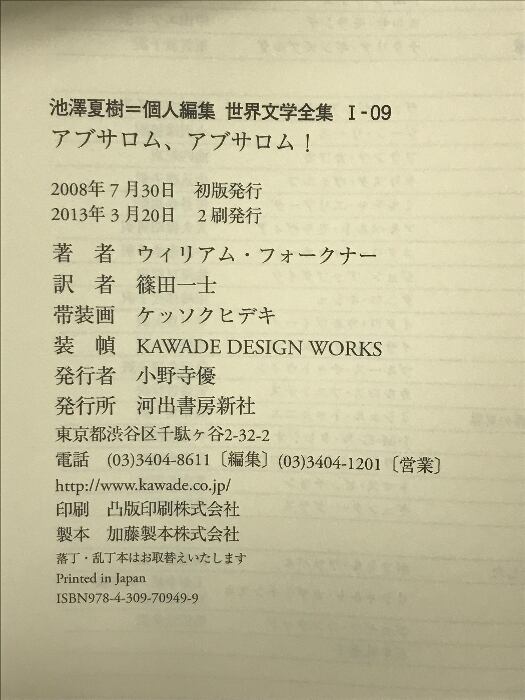 タイトル:アブサロム、アブサロム! (池澤夏樹=個人編集 世界文学全集 1-9) 河出書房新社 ウィリアム フォークナー