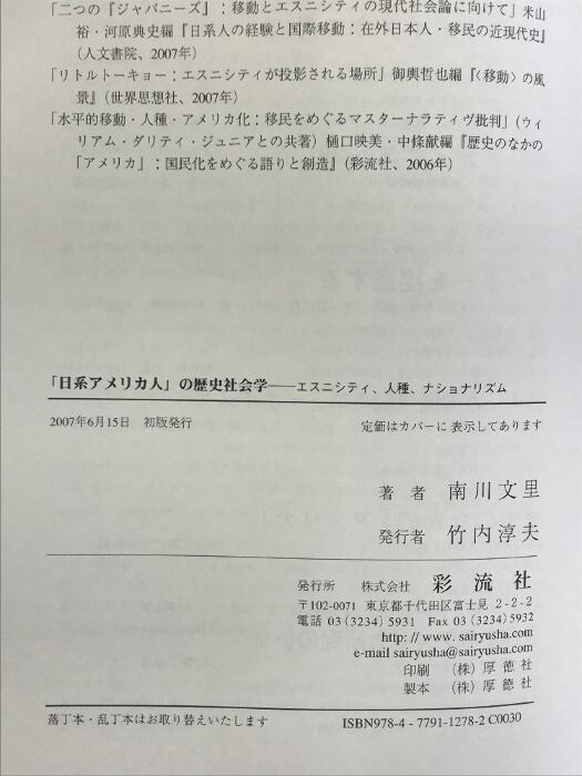 タイトル:「日系アメリカ人」の歴史社会学: エスニシティ、人種、ナショナリズム 彩流社 南川 文里